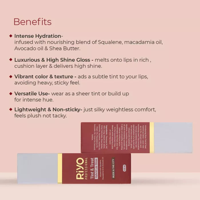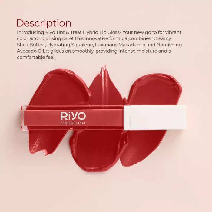 Introducing Riyo Tint & Treat Hybrid Lip Gloss- Your new go to for vibrant color and nourising care! This innovative formula combines Creamy Shea Butter , Hydrating Squalene, Luxurious Macadamia and Nourishing Avocado Oil, it glides on smoothly, providing intense moisture and a comfortable feel.