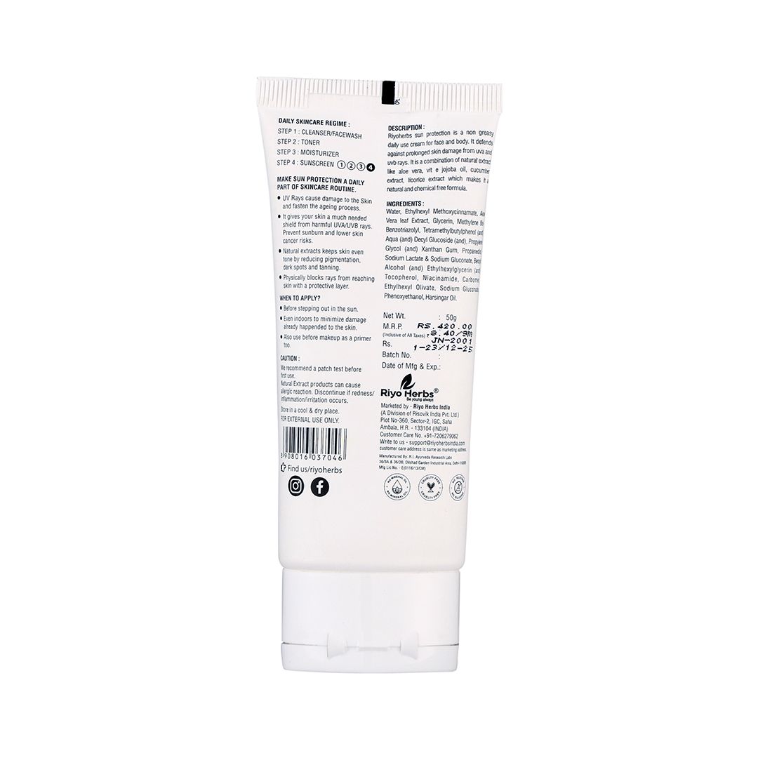 Riyoherbs SPF 50 Hydrating Sunscreen Cream provides high-level broad-spectrum protection against UVA & UVB rays to help protect skin from sun damage, tanning, and visible signs of photo-ageing. The formula is designed for daily use and offers effective sun defense without heaviness.